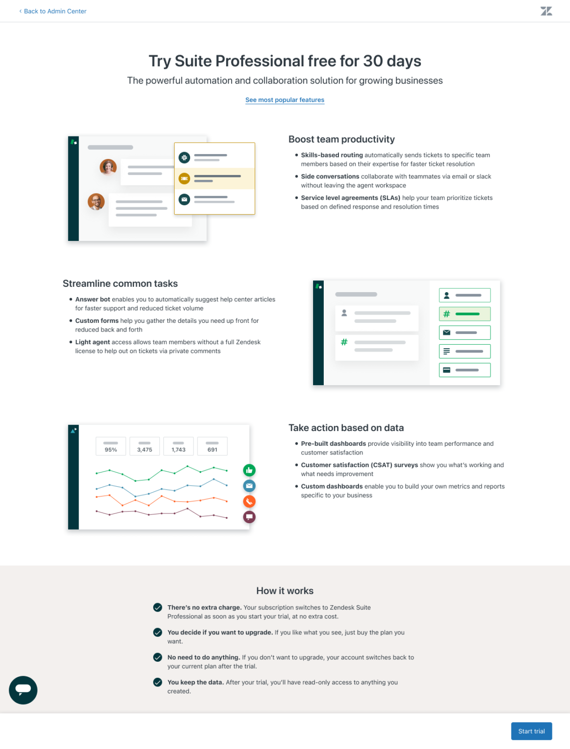 In late 2021, Zendesk’s expansion rate had flattened year over year. I led a cross-functional design sprint with Product, Engineering, and Design that resulted in Customer-Initiated Boosting (CIB), a self-service upsell trial experience that allowed customers to try add-ons and higher-tier plans before purchasing.