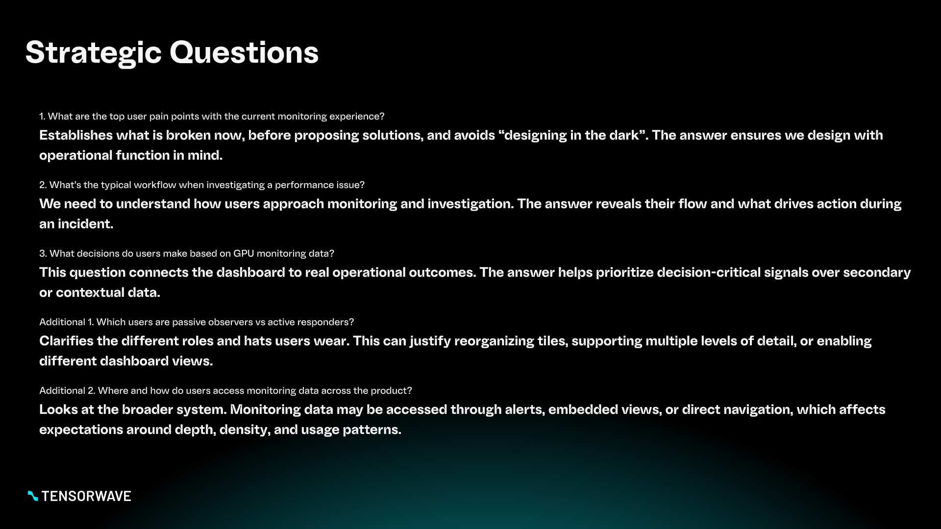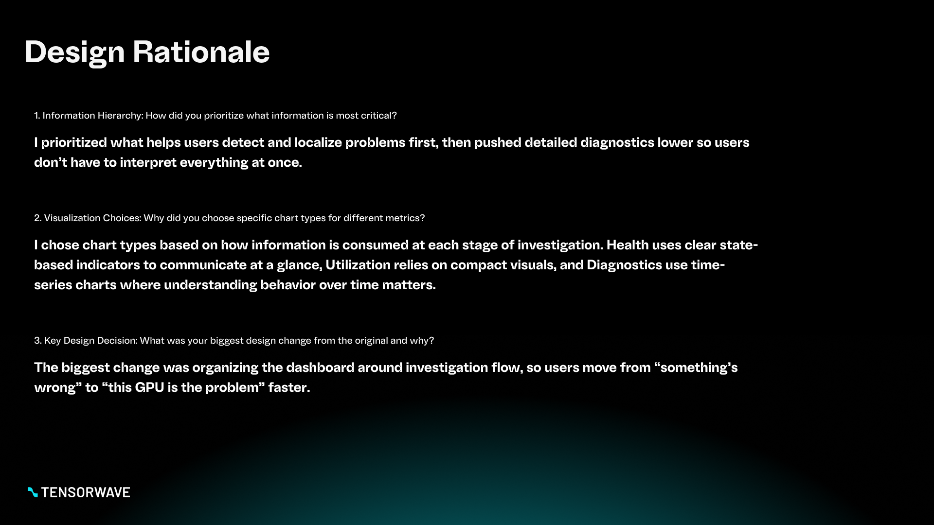 The original dashboard surfaced a large number of GPU and node metrics, but it lacked a strong hierarchy. Important signals were visually competing with secondary data, making it harder to answer common operational questions quickly.