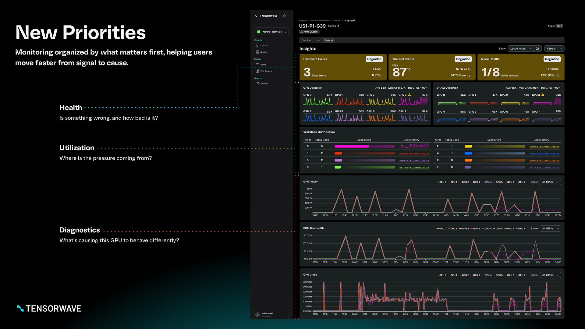 I introduced a top-level health section designed for fast scanning. It surfaces the most actionable signals first, such as thermal and error states, without requiring users to interpret multiple charts to understand whether something is wrong.