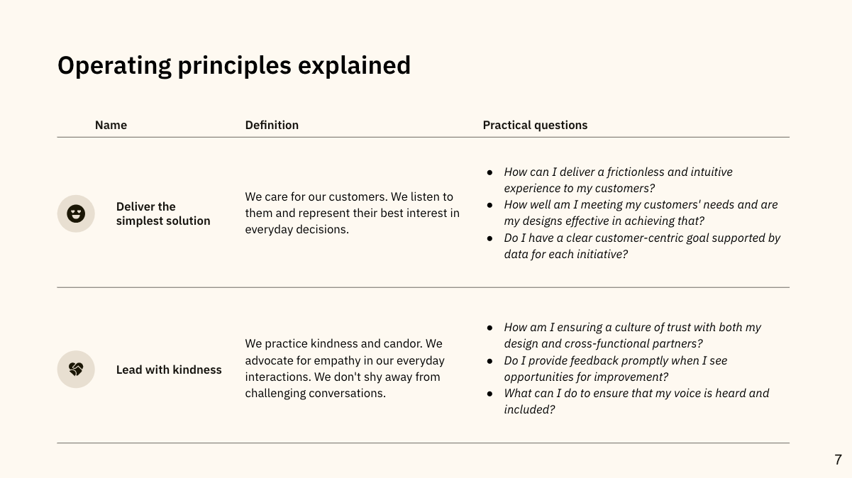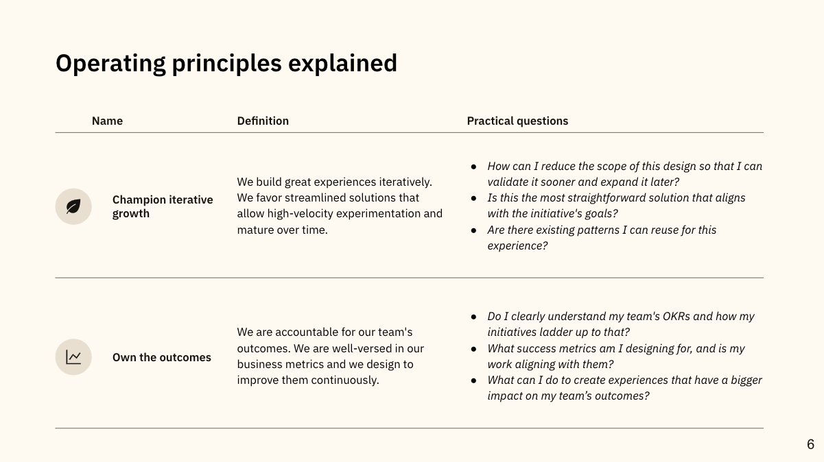 - Solution: I developed a 2024 design kickoff deck, which I presented at a design staff meeting in January. This deck outlined the principles for the year, the new surface areas, and clear guidelines on roadmap planning, project tracking, and rituals like design reviews. I also introduced new processes, such as async reviews and a buddy program, to help the team adjust to the new structure.